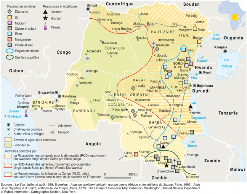 Figure 2. Les richesses minières du Congo et zone de localisations (Atlas du continent africain, groupe jeune Afrique et édition du Jaguar, 2000, Nations unies, https://www.monde-diplomatique.fr/cartes/congomdv49, consulté le 08 août 2018).