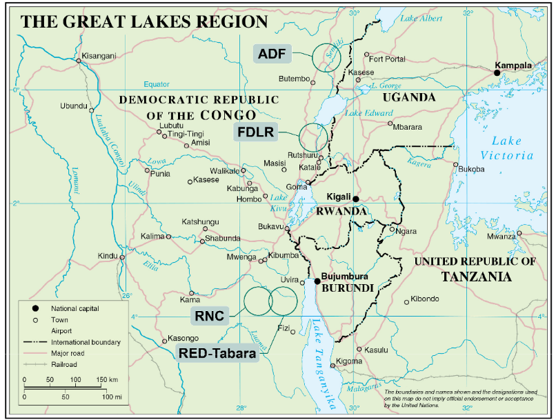 Trois États de la région des Grands Lacs – Burundi, Rwanda et Ouganda – s’accusent mutuellement de subversion, chacun reprochant à l’autre de soutenir des rebelles en République démocratique du Congo, leur voisin commun. Map No. 4004,1 UNITED NATIONS.